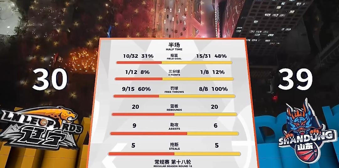 上半场双方场面比较难看,双方各种出手打铁、低级失误,争议判罚不少,辽宁半场15罚仅9中,山东8罚8中,两队合计三分球20中2,非常铁,不过山东外援还是强,克里斯鲍威尔后半节反击+中投+罚球连拿12分,山东一波4分钟14-5,半场取得39-30领先辽宁。
